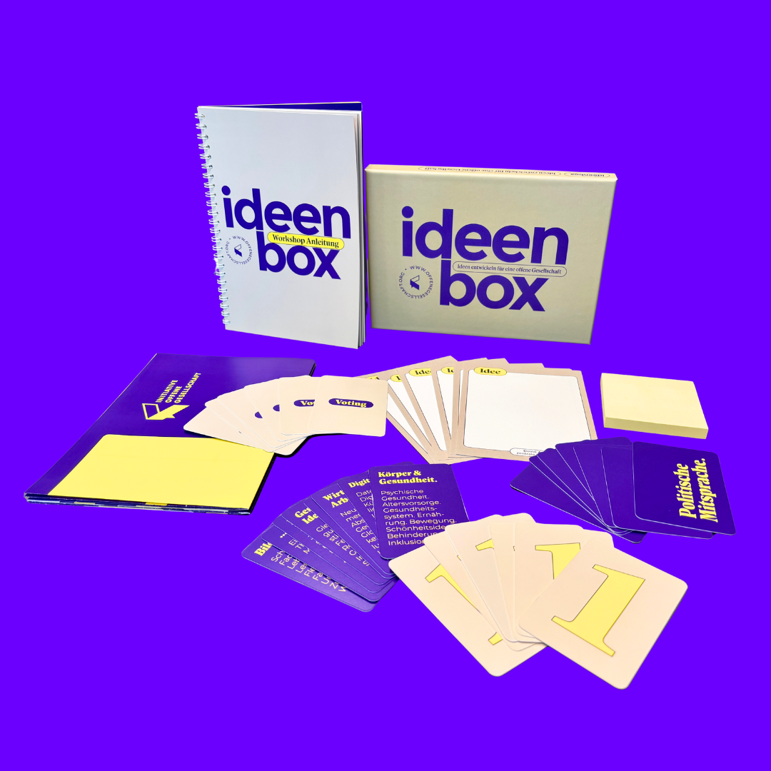 Dieses Bundle bringt alle zentralen Werkzeuge zusammen, um Gespräche anzuregen, Ideen zu entwickeln, Beteiligung zu ermöglichen und aktiv für eine offene Gesellschaft einzutreten. Egal ob im Workshop, in der Schule, im Verein oder in der Kommune – mit dem Boxen-Bundle hast du alles, was du brauchst, in einer Lösung.