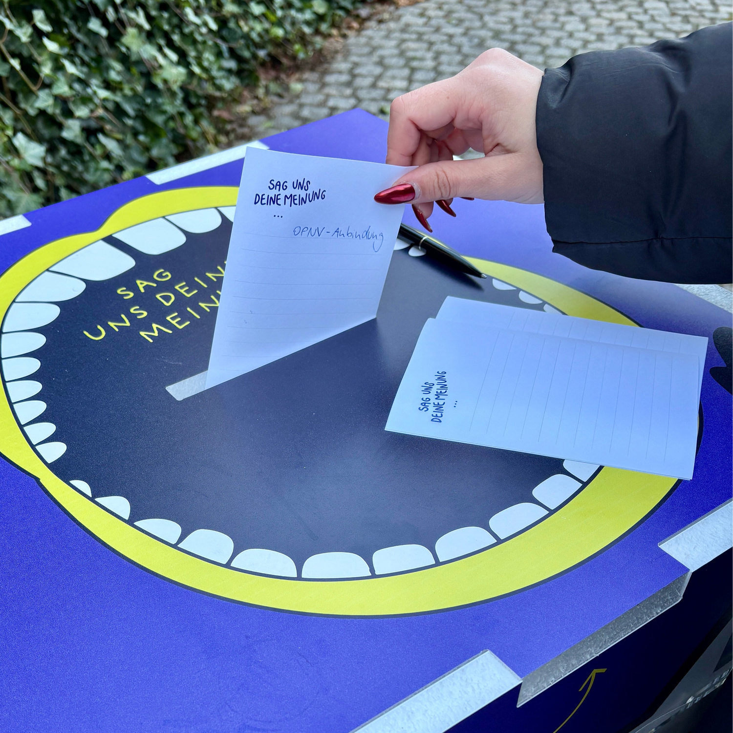 Dieser bunte Aufsteller funktioniert wie eine Wahlurne: Auf einen Zettel können Vorbei- kommende ihre Ideen schreiben. Diesen werfen sie dann in den mundförmigen Schlitz. Die Pappbox kann auf dem Boden stehen, passt aber auch auf einen Tisch.