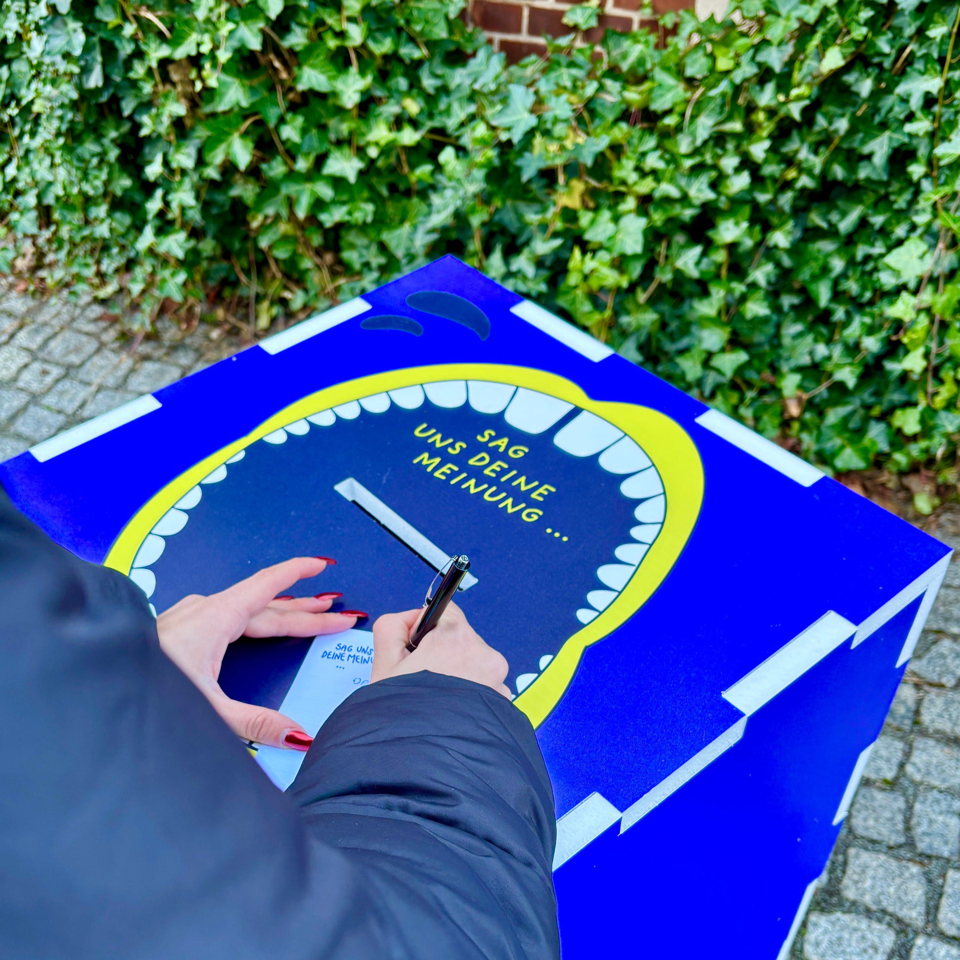 Dieser bunte Aufsteller funktioniert wie eine Wahlurne: Auf einen Zettel können Vorbeikommende ihre Ideen schreiben. Diesen werfen sie dann in den mundförmigen Schlitz. Die Pappbox kann auf dem Boden stehen, passt aber auch auf einen Tisch.